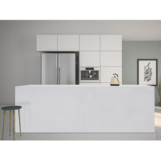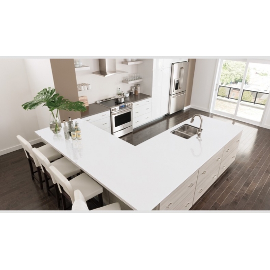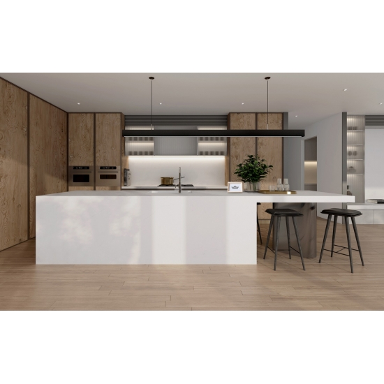 El Cuarzo Blanco Puro Brillante es una piedra de cuarzo artificial con un tratamiento especial que se diferencia de otras series por su aspecto más brillante. Este cuarzo aporta profundidad y textura al instalarse en paredes, suelos, encimeras, etc. Se puede utilizar para crear impresionantes piezas de pared y salpicaderos de lavabos en baños y cocinas. Este cuarzo funciona muy bien en zonas húmedas gracias a sus propiedades antigérmenes y resistentes a la humedad.