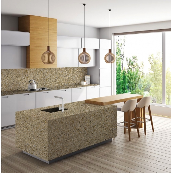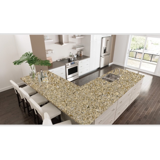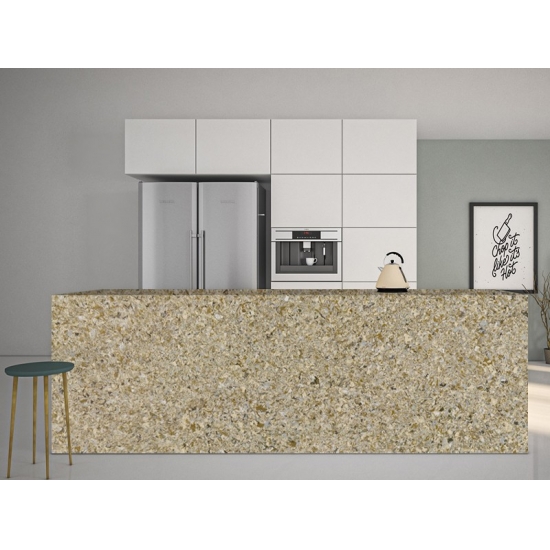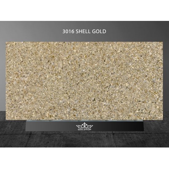 Shell Gold Quartz White es una piedra de cuarzo artificial con un tratamiento especial que se diferencia de otras series por su aspecto más brillante. Este cuarzo aporta profundidad y textura al instalarse en paredes, suelos, encimeras, etc. Se puede utilizar para crear impresionantes piezas de pared y salpicaderos de lavabos en baños y cocinas. Este cuarzo funciona muy bien en zonas húmedas gracias a sus propiedades antigérmenes y resistentes a la humedad.