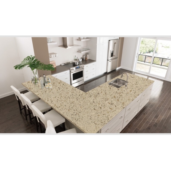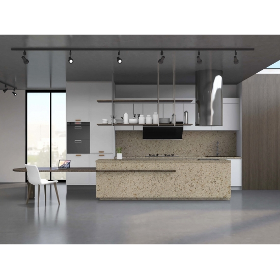 Sparkle Quartz Sand Leaf es una piedra de cuarzo artificial con un tratamiento especial que se diferencia de otras series por su aspecto más brillante. Este cuarzo aporta profundidad y textura al instalarse en paredes, suelos, encimeras, etc. Se puede utilizar para crear impresionantes piezas de pared y salpicaderos de lavabos en baños y cocinas. Este cuarzo funciona muy bien en zonas húmedas gracias a sus propiedades antigérmenes y resistentes a la humedad.