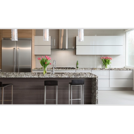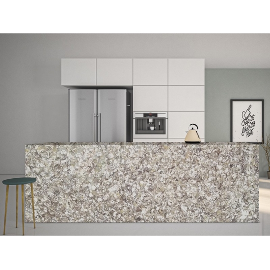 El Cuarzo Brillante Gold Coast es una piedra de cuarzo artificial con un tratamiento especial que se diferencia de otras series por su aspecto más brillante. Este cuarzo aporta profundidad y textura al instalarse en paredes, suelos, encimeras, etc. Se puede utilizar para crear impresionantes piezas de pared y salpicaderos de lavabos en baños y cocinas. Este cuarzo funciona muy bien en zonas húmedas gracias a sus propiedades antigérmenes y resistentes a la humedad.