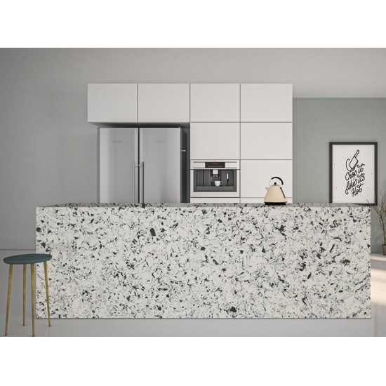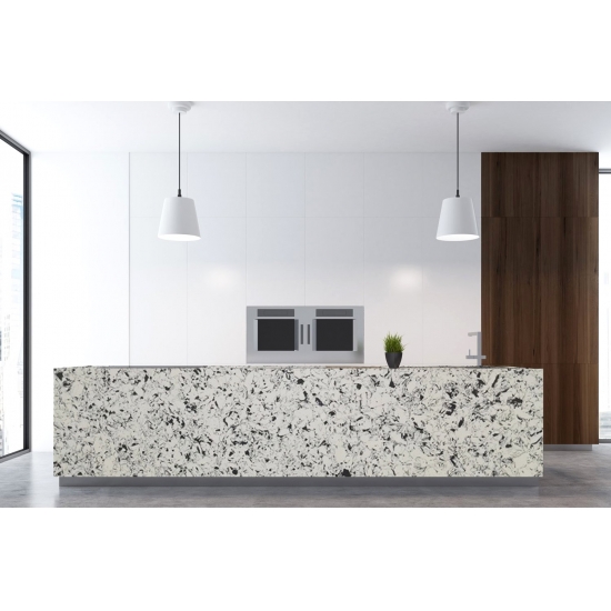El Cuarzo Brillante Ink Plant es una piedra de cuarzo artificial con un tratamiento especial que se diferencia de otras series por su aspecto más brillante. Este cuarzo aporta profundidad y textura al instalarse en paredes, suelos, encimeras, etc. Se puede utilizar para crear impresionantes piezas de pared y salpicaderos de lavabos en baños y cocinas. Este cuarzo funciona muy bien en zonas húmedas gracias a sus propiedades antigérmenes y resistentes a la humedad.