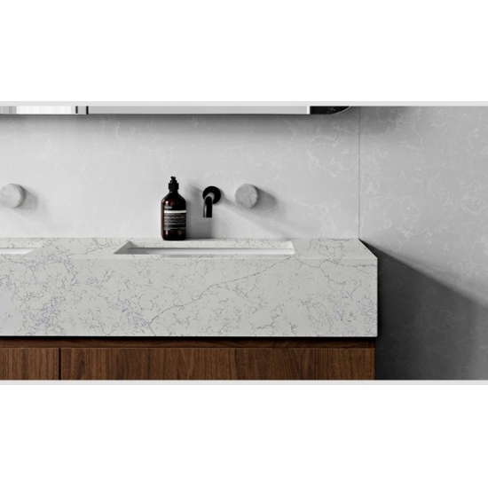 Losa de cuarzo 4001 Beyond Marble Presenta una apariencia refinada y elegante inspirada en la estética del mármol natural. Su fondo suave y claro se ve realzado por vetas delicadas y fluidas que crean una sensación equilibrada de movimiento y armonía. La superficie se siente limpia y expresiva, ofreciendo profundidad visual sin resultar abrumadora. Este cuarzo encarna una sofisticación atemporal, lo que lo convierte en la opción ideal tanto para interiores modernos como clásicos, aportando una sensación de lujo discreto a cocinas, baños y espacios comerciales de alta gama.