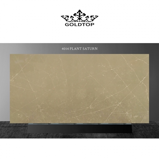 4014 Planta Saturno Mármol Cuarzo Presenta una apariencia elegante y refinada, con un fondo suave y cremoso, bellamente acentuado por vetas ondulantes en tonos grises y dorados sutiles. El intrincado veteado crea una sensación natural de movimiento y profundidad, otorgando a la superficie un carácter sofisticado similar al mármol. Esta losa de cuarzo está diseñada para realzar cualquier espacio, añadiendo un toque de lujo atemporal y opulencia discreta a encimeras, tocadores o paredes destacadas.