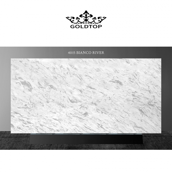 4015 Cuarzo de mármol de río Bianco Presenta una apariencia serena y elegante con un suave fondo blanco acentuado por delicadas y fluidas vetas grises. La superficie irradia sofisticación, ya que las sutiles vetas aportan movimiento y profundidad naturales, creando una sensación de calma y refinamiento. Este cuarzo está diseñado para realzar cualquier espacio, ofreciendo una belleza atemporal que combina a la perfección con interiores modernos y clásicos.