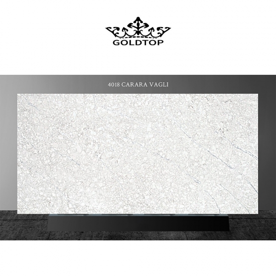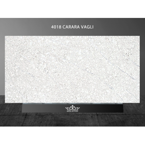 4018 Cuarzo Mármol Carrara Vagli Presenta una apariencia atemporal y elegante con su suave fondo blanco, bellamente acentuado por delicadas vetas grises que fluyen naturalmente por la superficie. El sutil contraste de las vetas con el suave fondo irradia refinamiento y sofisticación, creando una sensación de armonía y movimiento. Esta losa de cuarzo está diseñada para realzar cualquier espacio con una estética clásica y lujosa, aportando un toque de sobria opulencia a encimeras, tocadores o paredes destacadas.