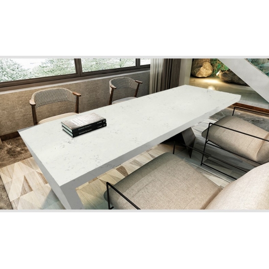 Losa de cuarzo de mármol blanco de Carrara 4044 Presenta una apariencia limpia y atemporal con su suave fondo blanco, realzado por delicadas y fluidas vetas grises. La superficie irradia una elegancia discreta, mientras que los sutiles patrones inspirados en el mármol crean una apariencia refinada y armoniosa, aportando profundidad sin sobrecargar el espacio. Este cuarzo está diseñado para ofrecer una estética clásica, aportando una sensación de luminosidad, equilibrio y sofisticación tanto a interiores residenciales como comerciales.