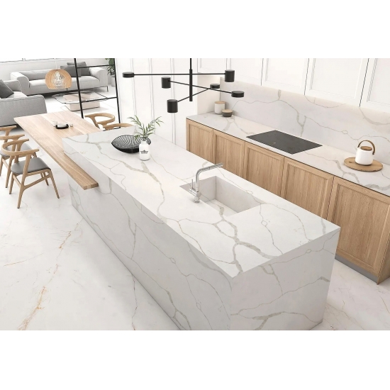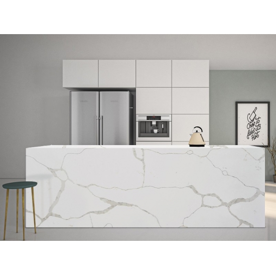El cuarzo Calacatta está hecho de componentes naturales, pero es resistente, duradero y de baja porosidad, lo que hace que los productos de piedra de cuarzo sean prácticamente resistentes al desgaste. Su durabilidad, comodidad y un diseño uniforme son las principales razones de su creciente popularidad. El cuarzo está compuesto en un 90 % por piedra natural; el resto se compone de pegamento, tintes y aditivos que mejoran sus propiedades técnicas. Su permeabilidad al agua y resistencia a las manchas realzan la belleza del cuarzo.