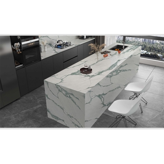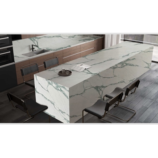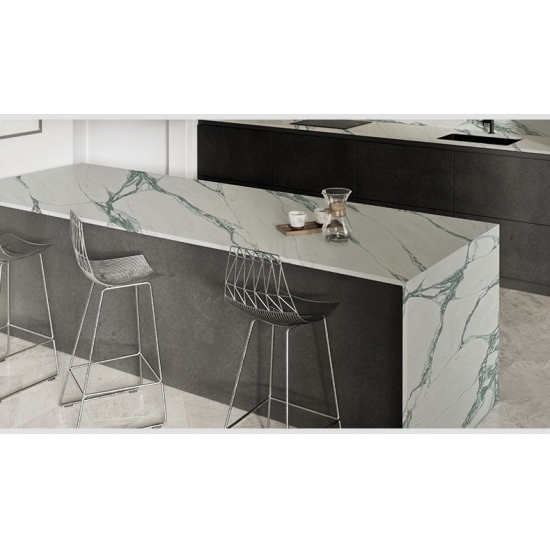 Cuarzo Calacatta Grigio. La serie de cuarzo Calacatta es actualmente el producto de piedra de cuarzo más popular. Este cuarzo ofrece el aspecto natural del mármol Calacatta, pero sin las desventajas de las encimeras de mármol. El cuarzo Calacatta es una encimera muy duradera, resistente a las manchas y a los arañazos, lo que la convierte en una opción muy práctica para encimeras de cocina y baño, escaleras, alféizares, muebles a medida, aplicaciones en paredes y suelos interiores y exteriores, diseños con chorro de agua y otros proyectos de diseño.