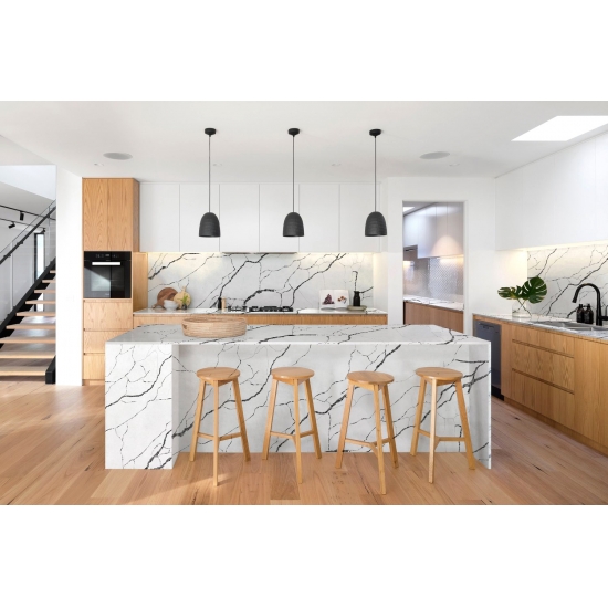 El cuarzo Calacatta Blanco Volakas 5044 es ideal para diversas aplicaciones gracias a su elegancia atemporal y diseño versátil. Este cuarzo pulido se utiliza comúnmente en encimeras de cocina, tocadores de baño y salpicaderos, donde su superficie blanca y limpia con suaves vetas grises aporta un toque de sofisticación. También es perfecto para revestimientos de paredes y suelos en espacios residenciales y comerciales.