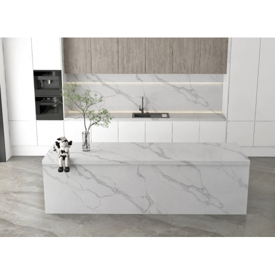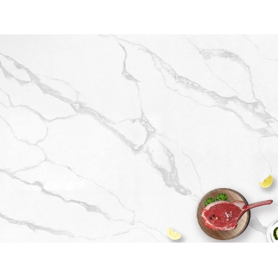 El cuarzo Calacatta está hecho de componentes naturales, pero es resistente, duradero y de baja porosidad, lo que hace que los productos de piedra de cuarzo sean prácticamente resistentes al desgaste. Su durabilidad, comodidad y un diseño uniforme son las principales razones de su creciente popularidad. El cuarzo está compuesto en un 90 % por piedra natural; el resto se compone de pegamento, tintes y aditivos que mejoran sus propiedades técnicas. Su permeabilidad al agua y resistencia a las manchas realzan la belleza del cuarzo.