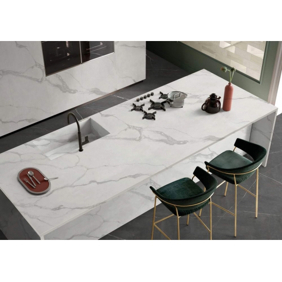 Este cuarzo es perfecto para una amplia gama de aplicaciones, desde encimeras e islas de cocina hasta paredes decorativas y tocadores. Su veteado audaz aporta carácter y sofisticación, convirtiéndolo en el punto focal de cualquier diseño. Ya sea combinado con elegantes tonos metálicos o cálidos tonos de madera, el Cuarzo Calacatta Fiorina 5125 realza la elegancia de cualquier espacio.