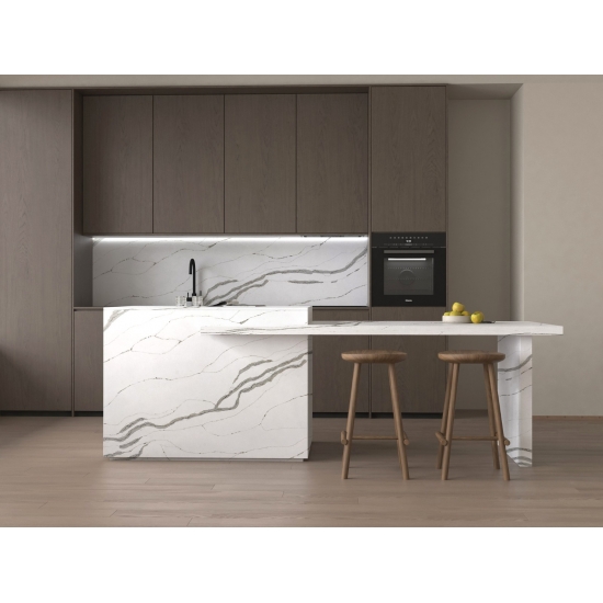 Este cuarzo es perfecto para una amplia gama de aplicaciones, desde encimeras e islas de cocina hasta paredes decorativas y tocadores. Su veteado audaz aporta carácter y sofisticación, convirtiéndolo en el punto focal de cualquier diseño. Ya sea combinado con elegantes tonos metálicos o cálidos tonos de madera, el Cuarzo Calacatta Fiorina 5125 realza la elegancia de cualquier espacio.