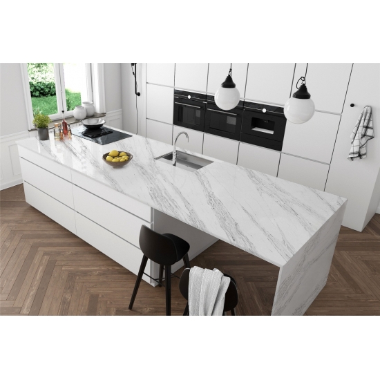 Exquisito y único, el Cuarzo Calacatta deslumbra con sus blancos limpios y su impactante veteado de aspecto mármol. Con su hermoso y llamativo patrón de vetas anchas y su tacto lujoso, este cuarzo ofrece el aspecto natural del mármol Calacatta, pero sin las desventajas de las encimeras de mármol. El cuarzo Calacatta es una encimera muy duradera, resistente a las manchas y a los arañazos, lo que la convierte en una opción muy práctica para encimeras de cocina y baño, escaleras, alféizares, muebles a medida, aplicaciones en paredes y suelos interiores y exteriores, diseños con chorro de agua y otros proyectos de diseño.