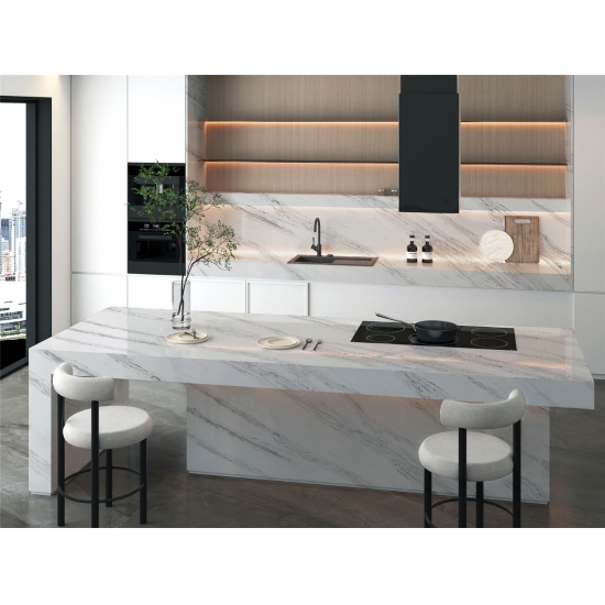 Este cuarzo es perfecto para una amplia gama de aplicaciones, desde encimeras e islas de cocina hasta paredes decorativas y tocadores. Su veteado audaz aporta carácter y sofisticación, convirtiéndolo en el punto focal de cualquier diseño. Ya sea combinado con elegantes tonos metálicos o cálidos tonos de madera, el Cuarzo Calacatta Fiorina 5125 realza la elegancia de cualquier espacio.
