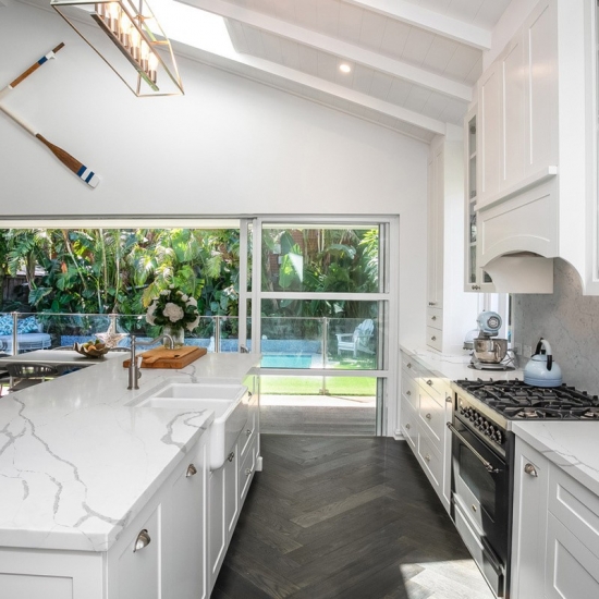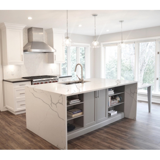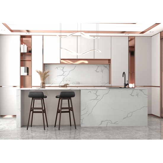 El cuarzo de la serie Calacatta es actualmente el producto de piedra de cuarzo más popular. Exquisito y único, el cuarzo Calacatta deslumbra con sus blancos limpios y su impactante veteado de aspecto mármol. Con su hermoso y llamativo patrón de vetas anchas y su tacto lujoso, este cuarzo ofrece el aspecto natural del mármol Calacatta, pero sin las desventajas de las encimeras de mármol. El cuarzo Calacatta es una encimera muy duradera, resistente a las manchas y a los arañazos, lo que lo convierte en una opción muy práctica para encimeras de cocina y baño, escaleras, alféizares, muebles a medida, aplicaciones en paredes y suelos interiores y exteriores, diseños con chorro de agua y otros proyectos de diseño.