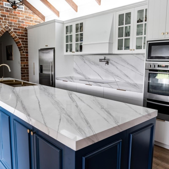 El cuarzo de la serie Calacatta es actualmente el producto de piedra de cuarzo más popular. Exquisito y único, el cuarzo Calacatta deslumbra con sus blancos limpios y su impactante veteado de aspecto mármol. Con su hermoso y llamativo patrón de vetas anchas y su tacto lujoso, este cuarzo ofrece el aspecto natural del mármol Calacatta, pero sin las desventajas de las encimeras de mármol. El cuarzo Calacatta es una encimera muy duradera, resistente a las manchas y a los arañazos, lo que lo convierte en una opción muy práctica para encimeras de cocina y baño, escaleras, alféizares, muebles a medida, aplicaciones en paredes y suelos interiores y exteriores, diseños con chorro de agua y otros proyectos de diseño.