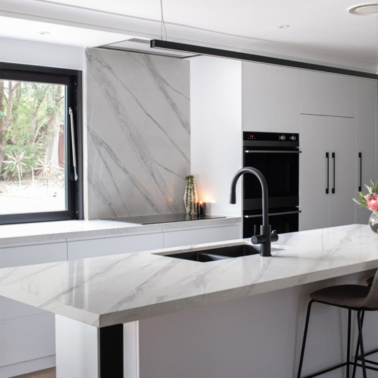 Exquisito y único, el Cuarzo Calacatta deslumbra con sus blancos limpios y su impactante veteado de aspecto mármol. Con su hermoso y llamativo patrón de vetas anchas y su tacto lujoso, este cuarzo ofrece el aspecto natural del mármol Calacatta, pero sin las desventajas de las encimeras de mármol. El cuarzo Calacatta es una encimera muy duradera, resistente a las manchas y a los arañazos, lo que la convierte en una opción muy práctica para encimeras de cocina y baño, escaleras, alféizares, muebles a medida, aplicaciones en paredes y suelos interiores y exteriores, diseños con chorro de agua y otros proyectos de diseño.
