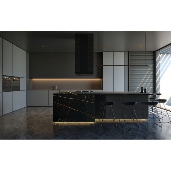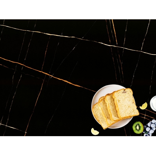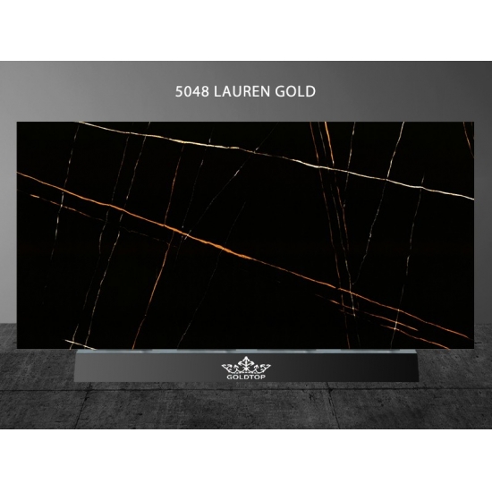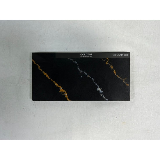 Black Lauren Gold. Fabricada con cuarzo de alta calidad, esta placa extragrande luce un blanco brillante, lo que la convierte en una opción versátil y elegante para cualquier diseño. Es duradera, fácil de mantener y resistente a rayones y manchas, ideal para zonas de mucho tránsito. Gracias a su gran tamaño, Black Lauren Gold es perfecta para crear superficies uniformes, ideal para encimeras de cocina, tocadores de baño y más.