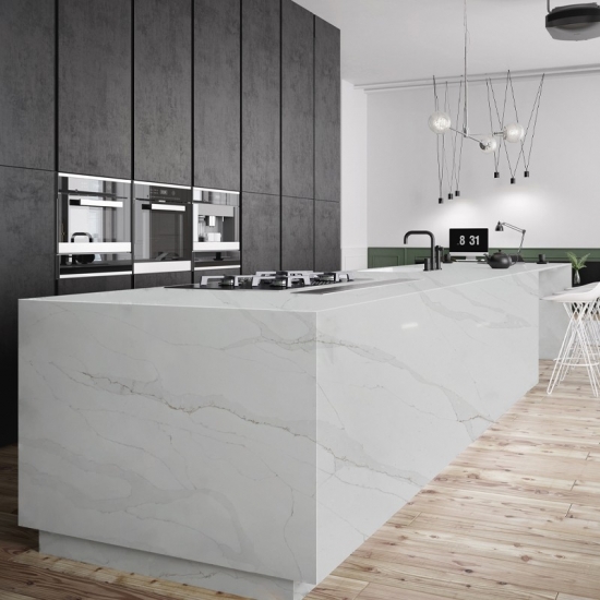 El cuarzo Calacatta está hecho de componentes naturales, pero es resistente, duradero y de baja porosidad, lo que hace que los productos de piedra de cuarzo sean prácticamente resistentes al desgaste. Su durabilidad, comodidad y un diseño uniforme son las principales razones de su creciente popularidad. El cuarzo está compuesto en un 90 % por piedra natural; el resto se compone de pegamento, tintes y aditivos que mejoran sus propiedades técnicas. Su permeabilidad al agua y resistencia a las manchas realzan la belleza del cuarzo.