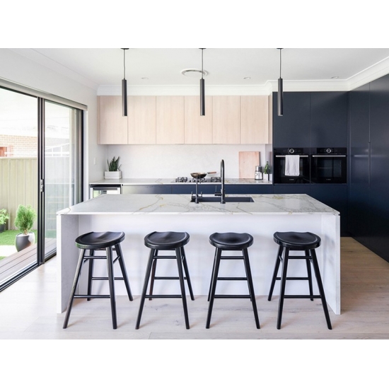 El cuarzo Calacatta está hecho de componentes naturales, pero es resistente, duradero y de baja porosidad, lo que hace que los productos de piedra de cuarzo sean prácticamente resistentes al desgaste. Su durabilidad, comodidad y un diseño uniforme son las principales razones de su creciente popularidad. El cuarzo está compuesto en un 90 % por piedra natural; el resto se compone de pegamento, tintes y aditivos que mejoran sus propiedades técnicas. Su permeabilidad al agua y resistencia a las manchas realzan la belleza del cuarzo.