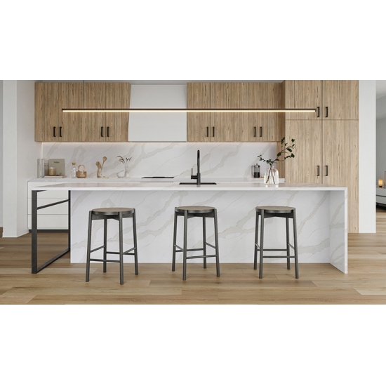 El Cuarzo Calacatta Paris 5059 presenta una base blanca brillante realzada por vetas grises audaces y dramáticas. El impactante contraste crea un impacto visual dinámico y lujoso. Esta losa encarna la elegancia moderna, perfecta para crear un ambiente sofisticado en cualquier espacio interior.