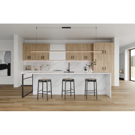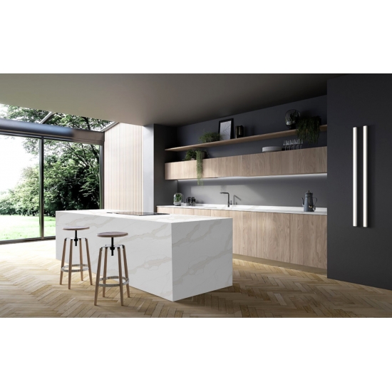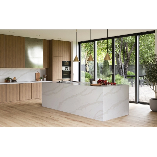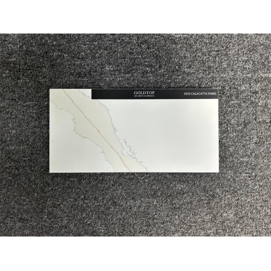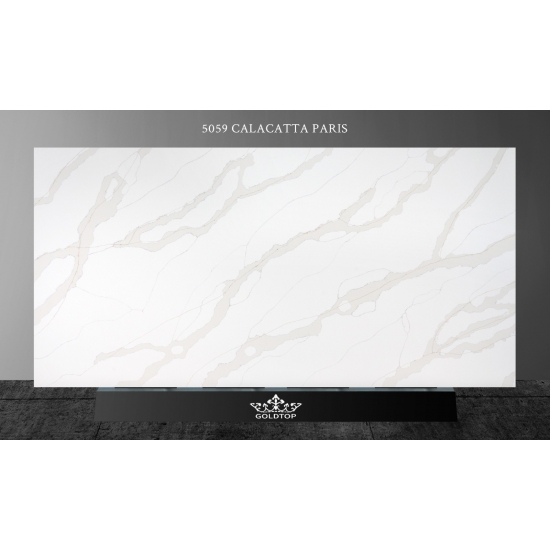 El cuarzo de la serie Calacatta es actualmente el producto de piedra de cuarzo más popular. Exquisito y único, el cuarzo Calacatta deslumbra con sus blancos limpios y su impactante veteado de aspecto mármol. Con su hermoso y llamativo patrón de vetas anchas y su tacto lujoso, este cuarzo ofrece el aspecto natural del mármol Calacatta, pero sin las desventajas de las encimeras de mármol. El cuarzo Calacatta es una encimera muy duradera, resistente a las manchas y a los arañazos, lo que lo convierte en una opción muy práctica para encimeras de cocina y baño, escaleras, alféizares, muebles a medida, aplicaciones en paredes y suelos interiores y exteriores, diseños con chorro de agua y otros proyectos de diseño.