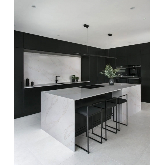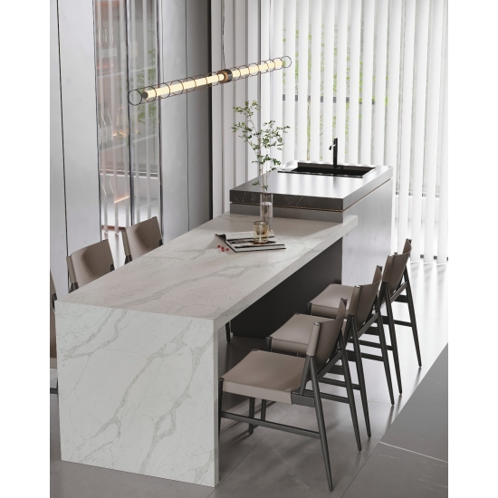 El cuarzo Calacatta 5063 Verona, al ser un cuarzo sin sílice, ofrece una opción más saludable y sostenible para superficies, especialmente en cocinas y baños. Su composición sin sílice lo hace más seguro para su instalación y reduce los riesgos para la salud asociados con la exposición al polvo de sílice. El elegante veteado Calacatta le da una lujosa apariencia similar al mármol, mientras que su superficie duradera y no porosa garantiza resistencia a manchas, rayones y calor. Esto lo convierte en una excelente opción para áreas de alto tránsito, combinando belleza, seguridad y bajo mantenimiento.