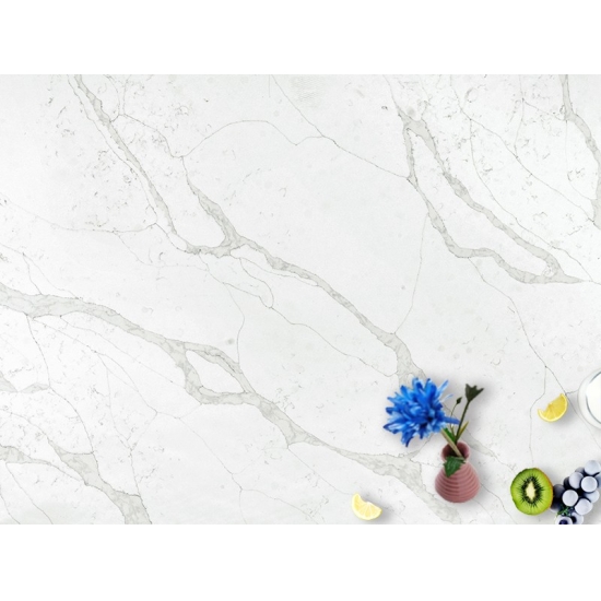 El cuarzo Calacatta 5063 Verona, al ser un cuarzo sin sílice, ofrece una opción más saludable y sostenible para superficies, especialmente en cocinas y baños. Su composición sin sílice lo hace más seguro para su instalación y reduce los riesgos para la salud asociados con la exposición al polvo de sílice. El elegante veteado Calacatta le da una lujosa apariencia similar al mármol, mientras que su superficie duradera y no porosa garantiza resistencia a manchas, rayones y calor.