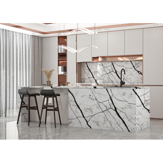 El cuarzo Calacatta Blanco Volakas 5044 es ideal para diversas aplicaciones gracias a su elegancia atemporal y diseño versátil. Este cuarzo pulido se utiliza comúnmente en encimeras de cocina, tocadores de baño y salpicaderos, donde su superficie blanca y limpia con suaves vetas grises aporta un toque de sofisticación. También es perfecto para revestimientos de paredes y suelos en espacios residenciales y comerciales.
