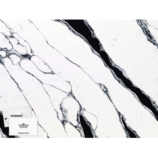 El cuarzo Calacatta está hecho de componentes naturales, pero es resistente, duradero y de baja porosidad, lo que hace que los productos de piedra de cuarzo sean prácticamente resistentes al desgaste. Su durabilidad, comodidad y un diseño uniforme son las principales razones de su creciente popularidad. El cuarzo está compuesto en un 90 % por piedra natural; el resto se compone de pegamento, tintes y aditivos que mejoran sus propiedades técnicas. Su permeabilidad al agua y resistencia a las manchas realzan la belleza del cuarzo.