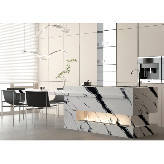 Este cuarzo es perfecto para una amplia gama de aplicaciones, desde encimeras e islas de cocina hasta paredes decorativas y tocadores. Su veteado audaz aporta carácter y sofisticación, convirtiéndolo en el punto focal de cualquier diseño. Ya sea combinado con elegantes tonos metálicos o cálidos tonos de madera, el Cuarzo Calacatta Fiorina 5125 realza la elegancia de cualquier espacio.