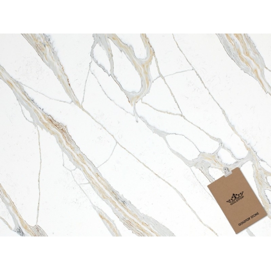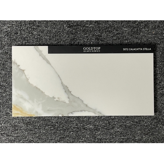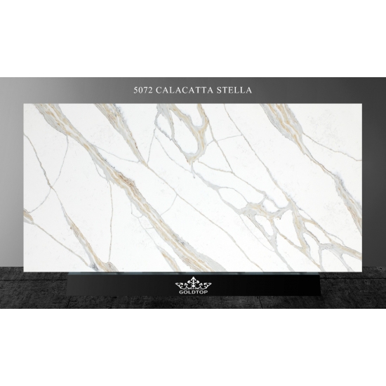 El cuarzo de la serie Calacatta es actualmente el producto de piedra de cuarzo más popular. Exquisito y único, el cuarzo Calacatta deslumbra con sus blancos limpios y su impactante veteado de aspecto mármol. Con su hermoso y llamativo patrón de vetas anchas y su tacto lujoso, este cuarzo ofrece el aspecto natural del mármol Calacatta, pero sin las desventajas de las encimeras de mármol. El cuarzo Calacatta es una encimera muy duradera, resistente a las manchas y a los arañazos, lo que lo convierte en una opción muy práctica para encimeras de cocina y baño, escaleras, alféizares, muebles a medida, aplicaciones en paredes y suelos interiores y exteriores, diseños con chorro de agua y otros proyectos de diseño.