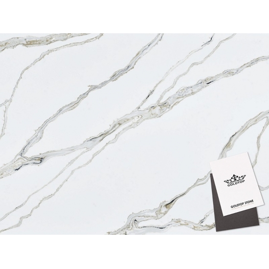 El cuarzo de la serie Calacatta es actualmente el producto de piedra de cuarzo más popular. Exquisito y único, el cuarzo Calacatta deslumbra con sus blancos limpios y su impactante veteado de aspecto mármol. Con su hermoso y llamativo patrón de vetas anchas y su tacto lujoso, este cuarzo ofrece el aspecto natural del mármol Calacatta, pero sin las desventajas de las encimeras de mármol. El cuarzo Calacatta es una encimera muy duradera, resistente a las manchas y a los arañazos, lo que lo convierte en una opción muy práctica para encimeras de cocina y baño, escaleras, alféizares, muebles a medida, aplicaciones en paredes y suelos interiores y exteriores, diseños con chorro de agua y otros proyectos de diseño.