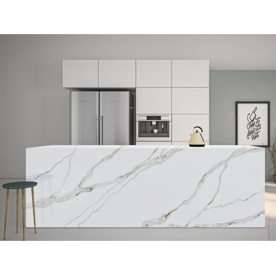 El cuarzo Calacatta está hecho de componentes naturales, pero es resistente, duradero y de baja porosidad, lo que hace que los productos de piedra de cuarzo sean prácticamente resistentes al desgaste. Su durabilidad, comodidad y un diseño uniforme son las principales razones de su creciente popularidad. El cuarzo está compuesto en un 90 % por piedra natural; el resto se compone de pegamento, tintes y aditivos que mejoran sus propiedades técnicas. Su permeabilidad al agua y resistencia a las manchas realzan la belleza del cuarzo.