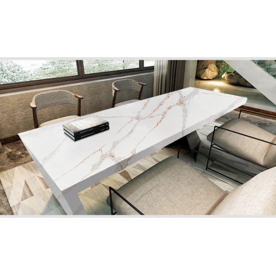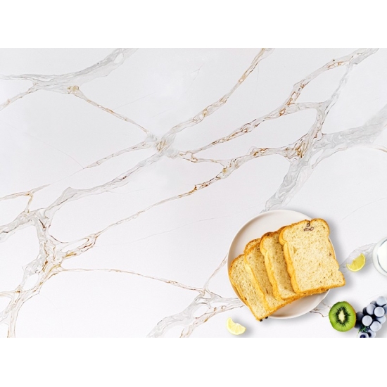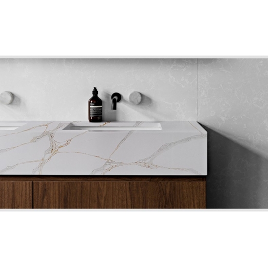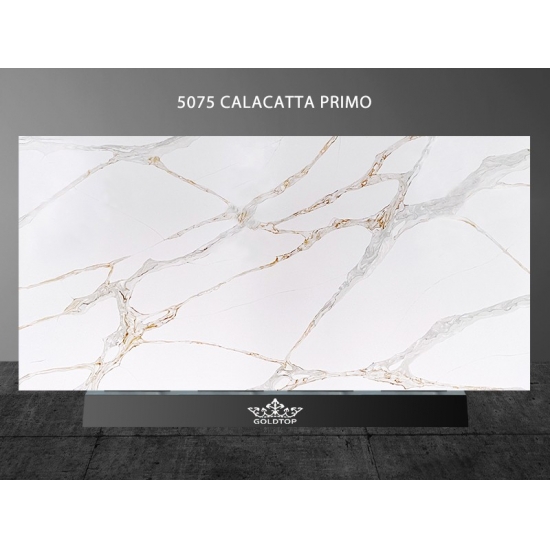 La losa de cuarzo Calacatta Primo 5075 presenta un impactante lienzo blanco realzado por vetas audaces y dramáticas en tonos grises. El intenso contraste crea un impacto visual potente y lujoso. Esta losa encarna la opulencia moderna, convirtiéndola en una pieza destacada ideal para cocinas y baños contemporáneos, realzando el espacio al instante con su elegancia decidida.