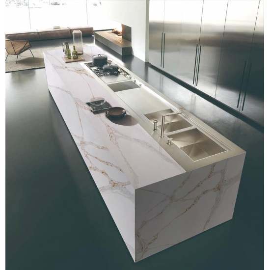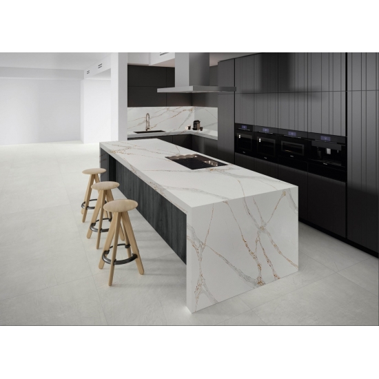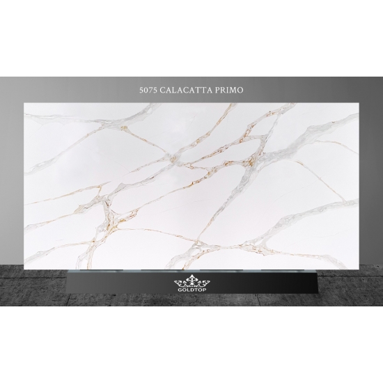 El cuarzo de la serie Calacatta es actualmente el producto de piedra de cuarzo más popular. Exquisito y único, el cuarzo Calacatta deslumbra con sus blancos limpios y su impactante veteado de aspecto mármol. Con su hermoso y llamativo patrón de vetas anchas y su tacto lujoso, este cuarzo ofrece el aspecto natural del mármol Calacatta, pero sin las desventajas de las encimeras de mármol. El cuarzo Calacatta es una encimera muy duradera, resistente a las manchas y a los arañazos, lo que lo convierte en una opción muy práctica para encimeras de cocina y baño, escaleras, alféizares, muebles a medida, aplicaciones en paredes y suelos interiores y exteriores, diseños con chorro de agua y otros proyectos de diseño.
