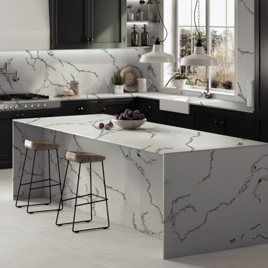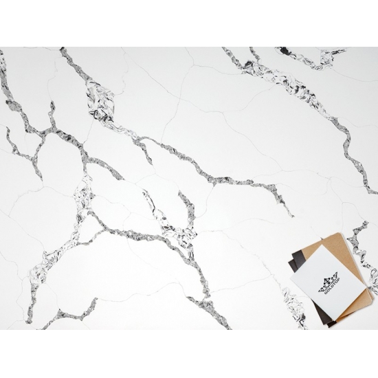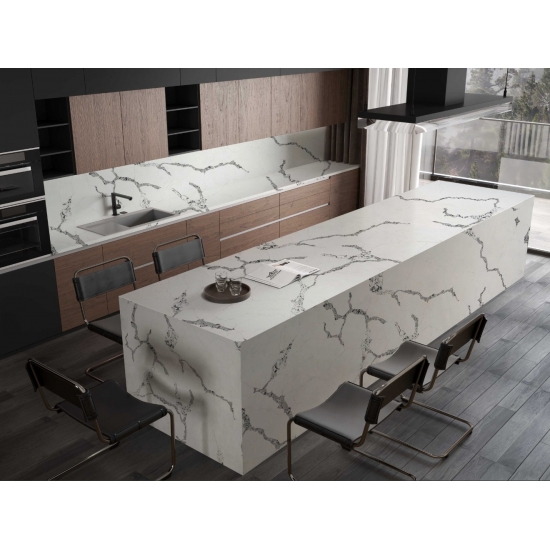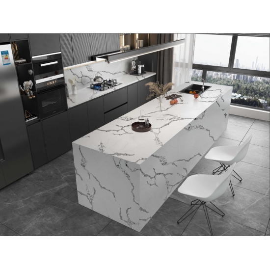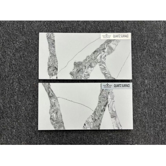 El cuarzo de la serie Calacatta es actualmente el producto de piedra de cuarzo más popular. Exquisito y único, el cuarzo Calacatta deslumbra con sus blancos limpios y su impactante veteado de aspecto mármol. Con su hermoso y llamativo patrón de vetas anchas y su tacto lujoso, este cuarzo ofrece el aspecto natural del mármol Calacatta, pero sin las desventajas de las encimeras de mármol. El cuarzo Calacatta es una encimera muy duradera, resistente a las manchas y a los arañazos, lo que lo convierte en una opción muy práctica para encimeras de cocina y baño, escaleras, alféizares, muebles a medida, aplicaciones en paredes y suelos interiores y exteriores, diseños con chorro de agua y otros proyectos de diseño.