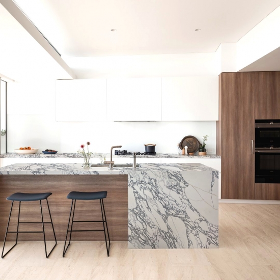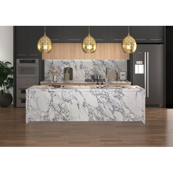 50 Square MetersExquisito y único, el Cuarzo Calacatta deslumbra con sus blancos limpios y su impactante veteado de aspecto mármol. Con su hermoso y llamativo patrón de vetas anchas y su tacto lujoso, este cuarzo ofrece el aspecto natural del mármol Calacatta, pero sin las desventajas de las encimeras de mármol. El cuarzo Calacatta es una encimera muy duradera, resistente a las manchas y a los arañazos, lo que la convierte en una opción muy práctica para encimeras de cocina y baño, escaleras, alféizares, muebles a medida, aplicaciones en paredes y suelos interiores y exteriores, diseños con chorro de agua y otros proyectos de diseño.