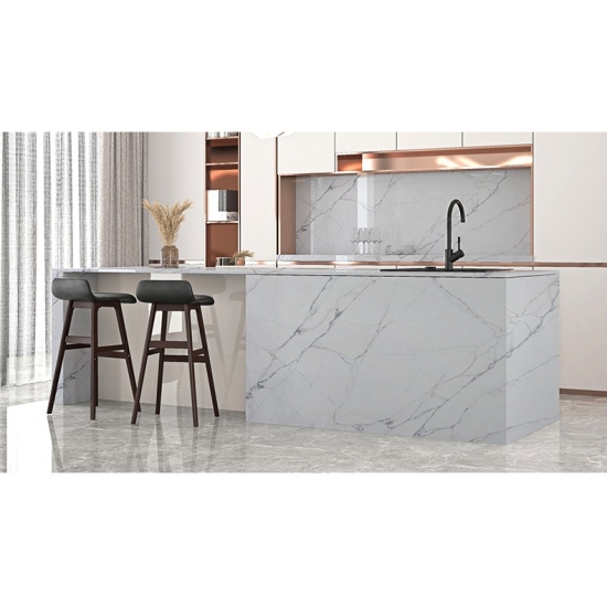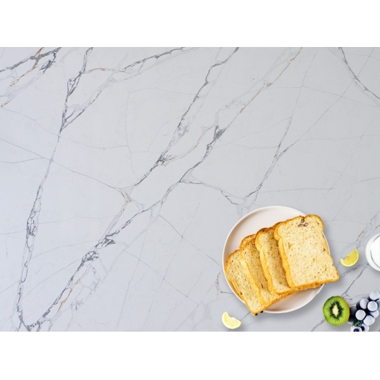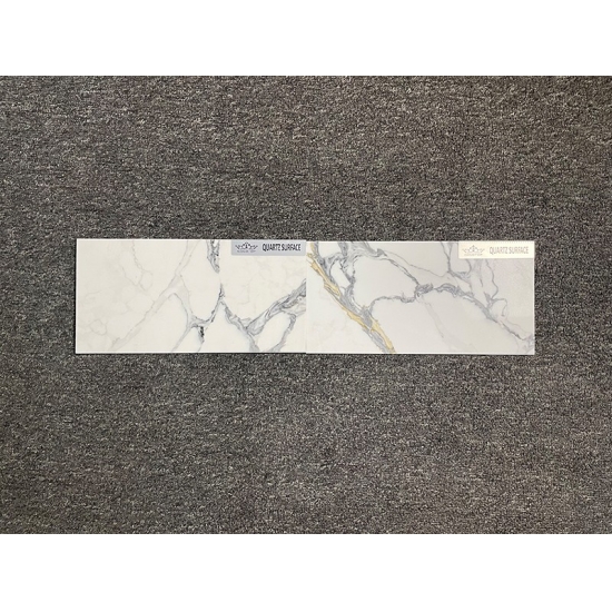 50 Square MetersExquisito y único, el Cuarzo Calacatta deslumbra con sus blancos limpios y su impactante veteado de aspecto mármol. Con su hermoso y llamativo patrón de vetas anchas y su tacto lujoso, este cuarzo ofrece el aspecto natural del mármol Calacatta, pero sin las desventajas de las encimeras de mármol. El cuarzo Calacatta es una encimera muy duradera, resistente a las manchas y a los arañazos, lo que la convierte en una opción muy práctica para encimeras de cocina y baño, escaleras, alféizares, muebles a medida, aplicaciones en paredes y suelos interiores y exteriores, diseños con chorro de agua y otros proyectos de diseño.