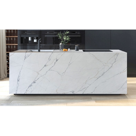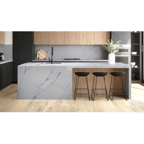 Exquisito y único, el Cuarzo Calacatta deslumbra con sus blancos limpios y su impactante veteado de aspecto mármol. Con su hermoso y llamativo patrón de vetas anchas y su tacto lujoso, este cuarzo ofrece el aspecto natural del mármol Calacatta, pero sin las desventajas de las encimeras de mármol. El cuarzo Calacatta es una encimera muy duradera, resistente a las manchas y a los arañazos, lo que la convierte en una opción muy práctica para encimeras de cocina y baño, escaleras, alféizares, muebles a medida, aplicaciones en paredes y suelos interiores y exteriores, diseños con chorro de agua y otros proyectos de diseño.