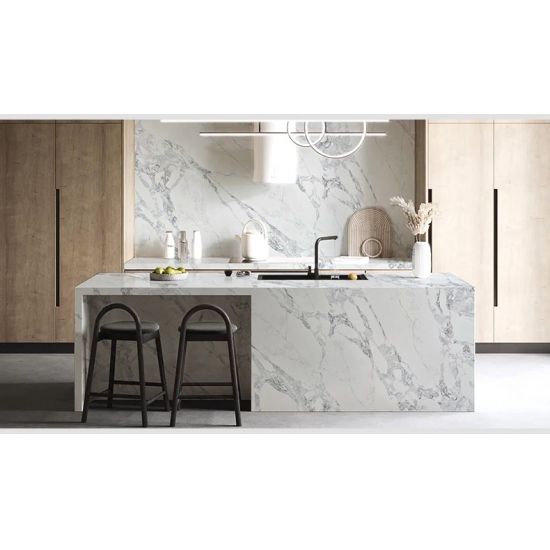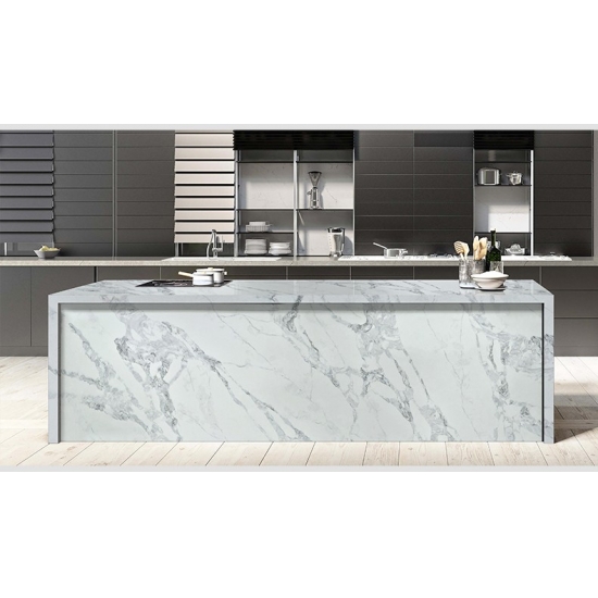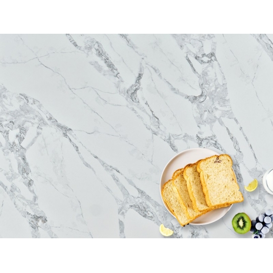50 Square MetersExquisito y único, el Cuarzo Calacatta deslumbra con sus blancos limpios y su impactante veteado de aspecto mármol. Con su hermoso y llamativo patrón de vetas anchas y su tacto lujoso, este cuarzo ofrece el aspecto natural del mármol Calacatta, pero sin las desventajas de las encimeras de mármol. El cuarzo Calacatta es una encimera muy duradera, resistente a las manchas y a los arañazos, lo que la convierte en una opción muy práctica para encimeras de cocina y baño, escaleras, alféizares, muebles a medida, aplicaciones en paredes y suelos interiores y exteriores, diseños con chorro de agua y otros proyectos de diseño.