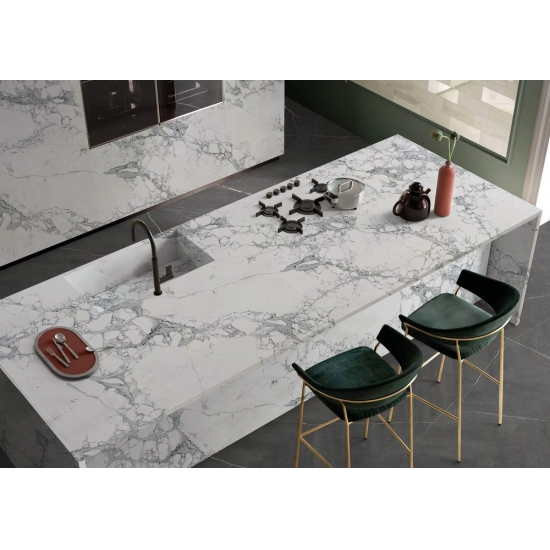 Exquisito y único, el Cuarzo Calacatta deslumbra con sus blancos limpios y su impactante veteado de aspecto mármol. Con su hermoso y llamativo patrón de vetas anchas y su tacto lujoso, este cuarzo ofrece el aspecto natural del mármol Calacatta, pero sin las desventajas de las encimeras de mármol. El cuarzo Calacatta es una encimera muy duradera, resistente a las manchas y a los arañazos, lo que la convierte en una opción muy práctica para encimeras de cocina y baño, escaleras, alféizares, muebles a medida, aplicaciones en paredes y suelos interiores y exteriores, diseños con chorro de agua y otros proyectos de diseño.