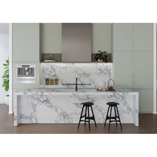 El cuarzo de la serie Calacatta es actualmente el producto de piedra de cuarzo más popular. Exquisito y único, el cuarzo Calacatta deslumbra con sus blancos limpios y su impactante veteado de aspecto mármol. Con su hermoso y llamativo patrón de vetas anchas y su tacto lujoso, este cuarzo ofrece el aspecto natural del mármol Calacatta, pero sin las desventajas de las encimeras de mármol. El cuarzo Calacatta es una encimera muy duradera, resistente a las manchas y a los arañazos, lo que lo convierte en una opción muy práctica para encimeras de cocina y baño, escaleras, alféizares, muebles a medida, aplicaciones en paredes y suelos interiores y exteriores, diseños con chorro de agua y otros proyectos de diseño.