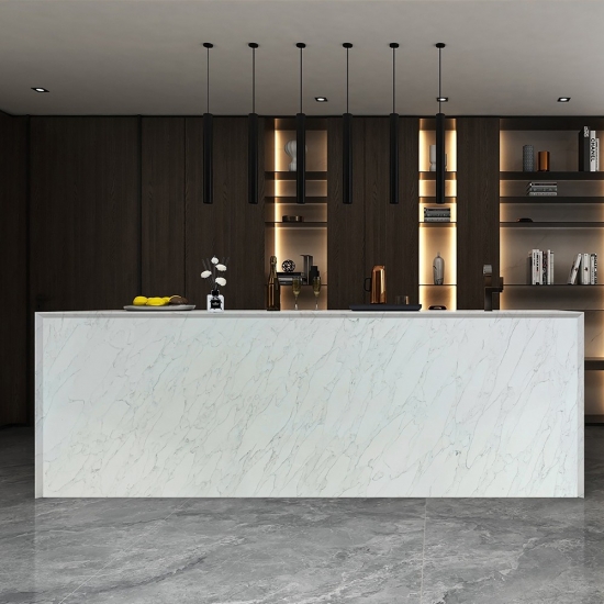 El cuarzo de la serie Calacatta es actualmente el producto de piedra de cuarzo más popular. Exquisito y único, el cuarzo Calacatta deslumbra con sus blancos limpios y su impactante veteado de aspecto mármol. Con su hermoso y llamativo patrón de vetas anchas y su tacto lujoso, este cuarzo ofrece el aspecto natural del mármol Calacatta, pero sin las desventajas de las encimeras de mármol. El cuarzo Calacatta es una encimera muy duradera, resistente a las manchas y a los arañazos, lo que lo convierte en una opción muy práctica para encimeras de cocina y baño, escaleras, alféizares, muebles a medida, aplicaciones en paredes y suelos interiores y exteriores, diseños con chorro de agua y otros proyectos de diseño.