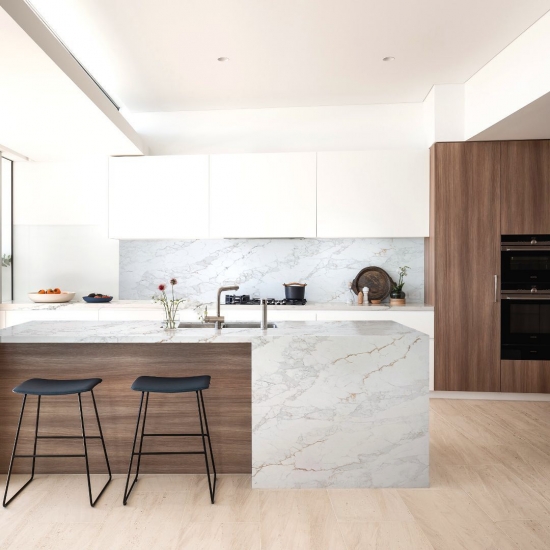 El cuarzo de la serie Calacatta es actualmente el producto de piedra de cuarzo más popular. Exquisito y único, el cuarzo Calacatta deslumbra con sus blancos limpios y su impactante veteado de aspecto mármol. Con su hermoso y llamativo patrón de vetas anchas y su tacto lujoso, este cuarzo ofrece el aspecto natural del mármol Calacatta, pero sin las desventajas de las encimeras de mármol. El cuarzo Calacatta es una encimera muy duradera, resistente a las manchas y a los arañazos, lo que lo convierte en una opción muy práctica para encimeras de cocina y baño, escaleras, alféizares, muebles a medida, aplicaciones en paredes y suelos interiores y exteriores, diseños con chorro de agua y otros proyectos de diseño.