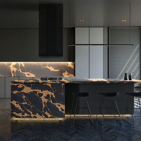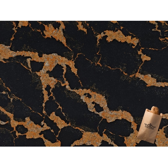 El Cuarzo Dorado Calacatta Extra Milan 5121 luce una apariencia audaz y dramática con su fondo negro intenso intercalado con finas partículas brillantes. La superficie irradia sofisticación, ya que los tonos oscuros contrastan con sutiles motas que captan la luz, creando una sensación de profundidad y movimiento. Este cuarzo está diseñado para destacar, añadiendo un toque de opulencia a cualquier espacio que adorne.