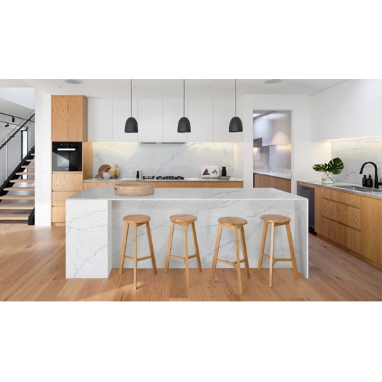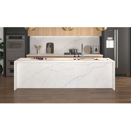 Calacatta Milas Quartz presenta una obra maestra de elegancia de ingeniería que captura la esencia del preciado mármol natural. Presenta un lienzo blanco cálido y acogedor, delicadamente barrido con delicadas vetas grises. Esta lujosa composición ofrece el dramatismo atemporal y la sofisticada belleza del mármol, ideal para crear un punto focal en cualquier interior. Disponible para encimeras, salpicaderos y paredes decorativas, ofrece una armoniosa combinación de inspiración clásica y lujo contemporáneo para cocinas, baños y más.
