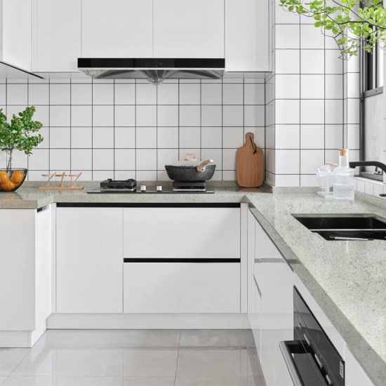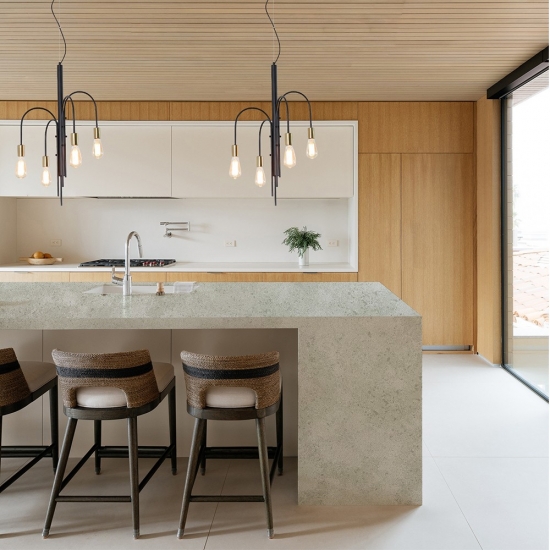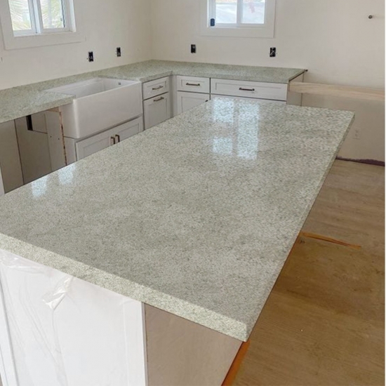 El cuarzo blanco cemento con textura de copo de nieve es una piedra artificial con un tratamiento especial. Similar a un acabado mate, el acabado de hormigón altera ligeramente el color del cuarzo en comparación con el clásico acabado pulido. Este acabado también se conoce como "cepillado" en el caso del granito.
