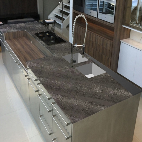 El cuarzo hormigón es un material de piedra artificial de cuarzo con un tratamiento especial. Similar a un acabado mate, el acabado de hormigón altera ligeramente el color del cuarzo en comparación con el clásico acabado pulido. Este acabado también se conoce como "cepillado" en el caso del granito.