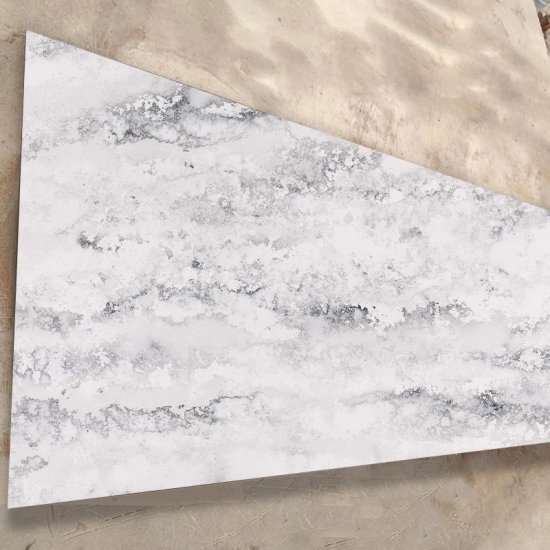 El cuarzo blanco cemento con textura de copo de nieve es una piedra artificial con un tratamiento especial. Similar a un acabado mate, el acabado de hormigón altera ligeramente el color del cuarzo en comparación con el clásico acabado pulido. Este acabado también se conoce como "cepillado" en el caso del granito.